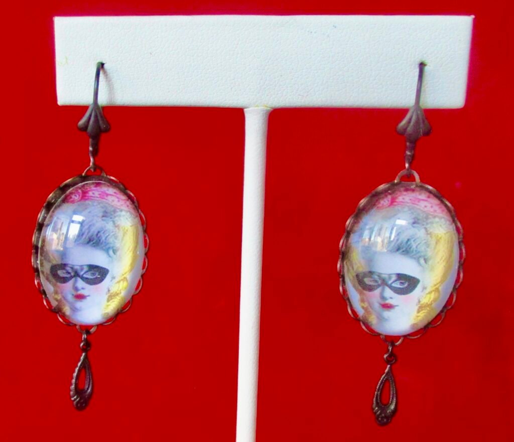 Pair of Vintage Marie Antoinette Cameo Glass Domed 2 1/4-Inch Earrings