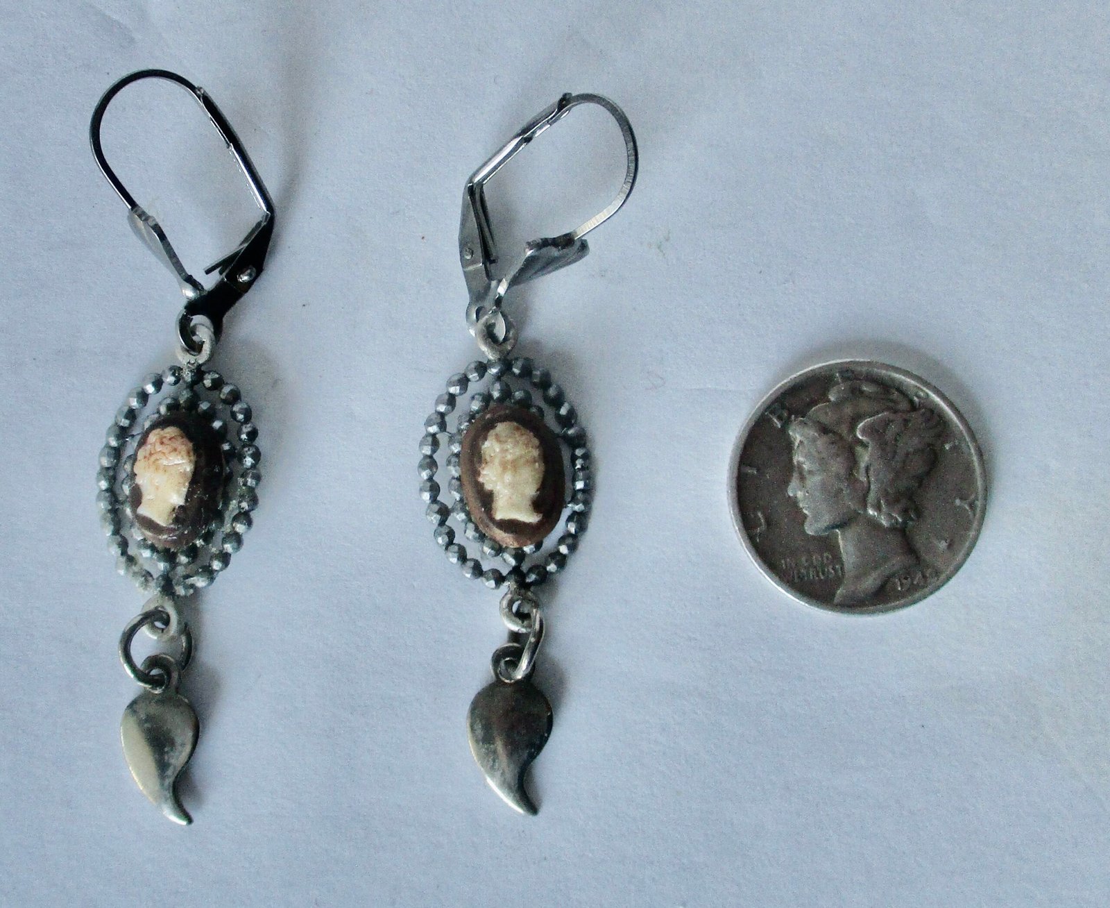 Tiny brown and beige ceramic handpainted cameos, set on an oval cut steel base. These antique components were first set as earrings in the 1980’s. Stainless steel ear wires were a later addition