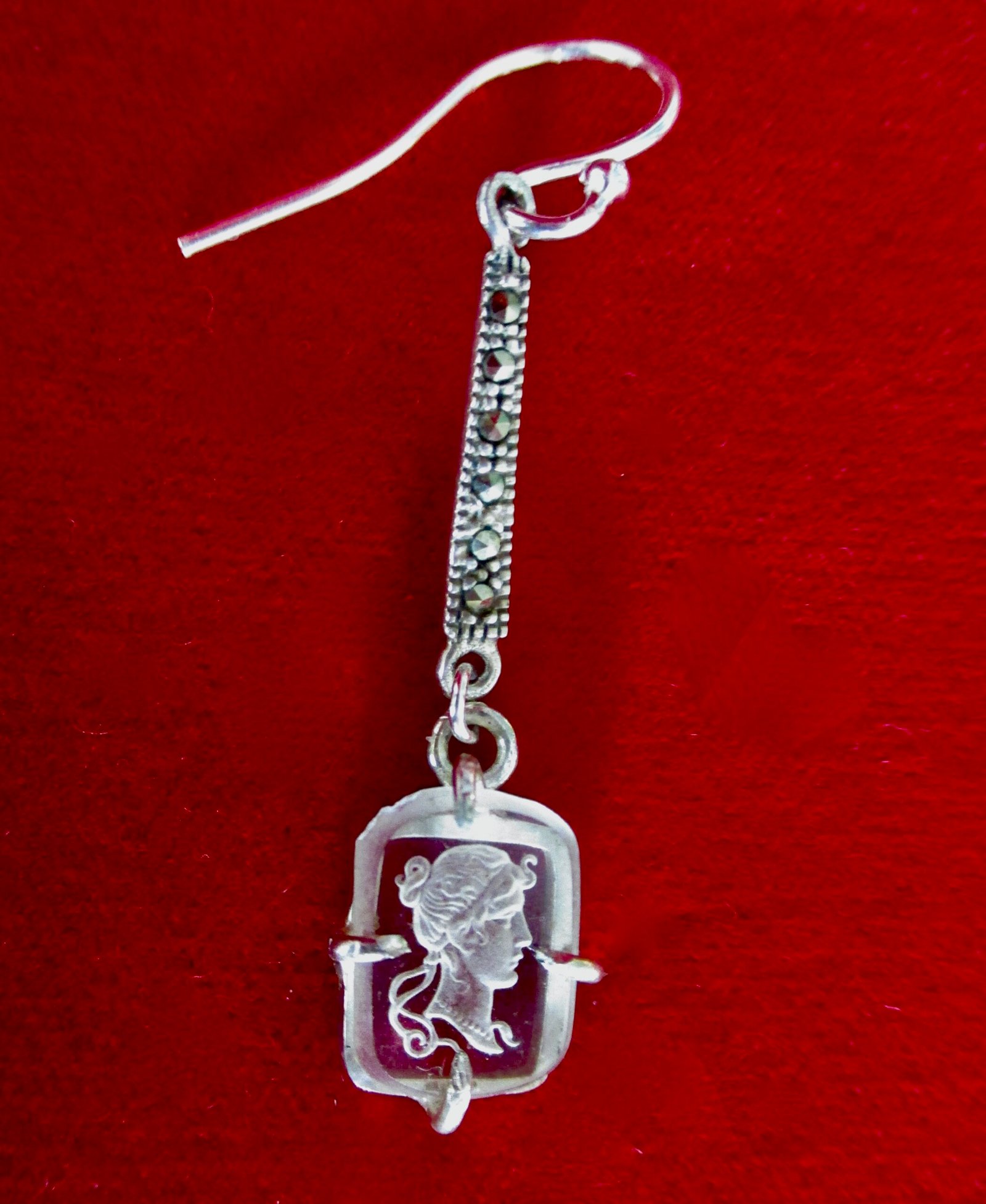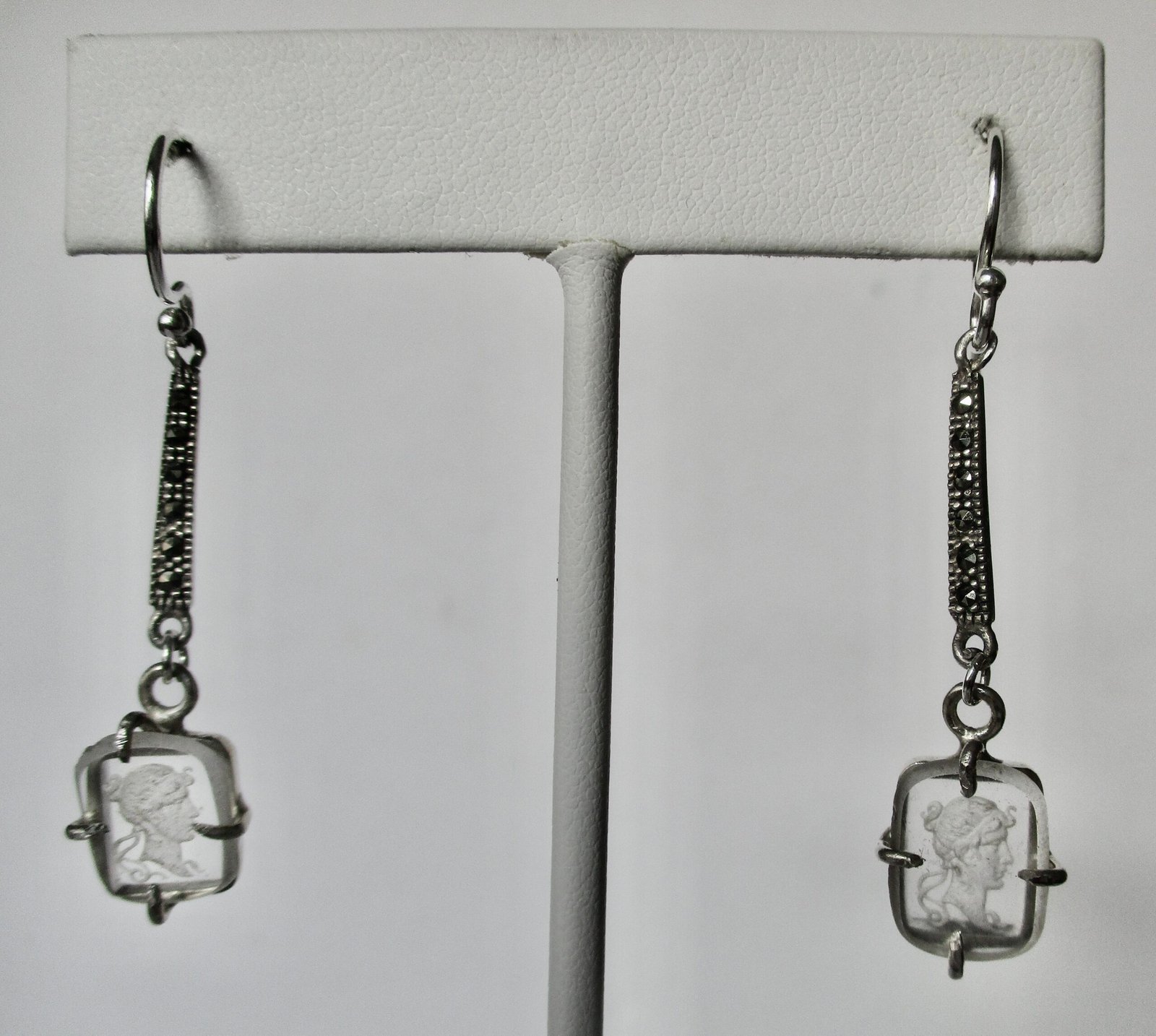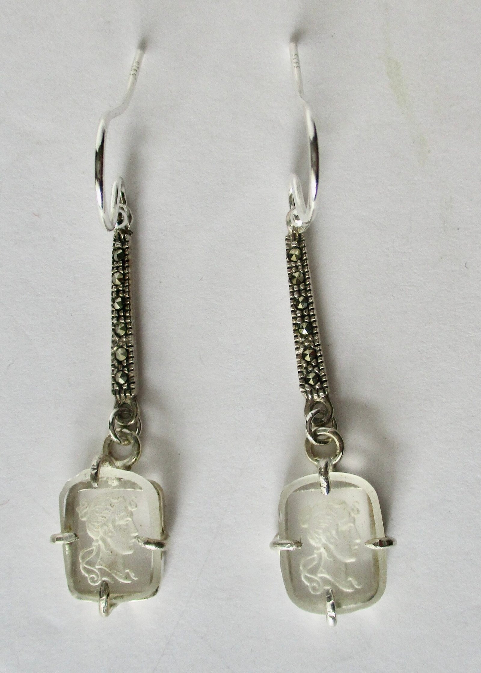 New-old stock. Reverse-etched rock crystal cameo earrings suspended from a sterling silver and marcasite stem. Never worn. Never sold