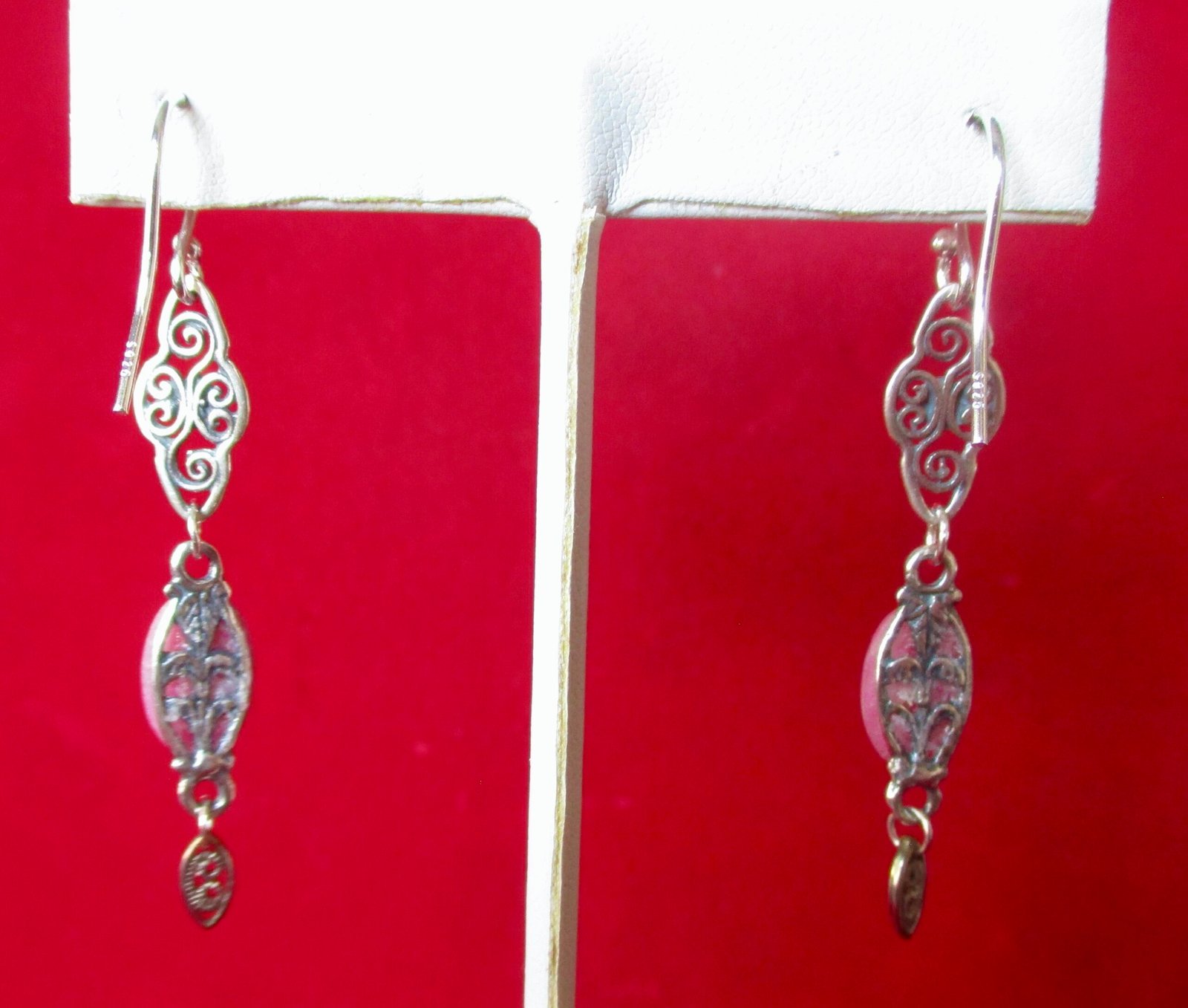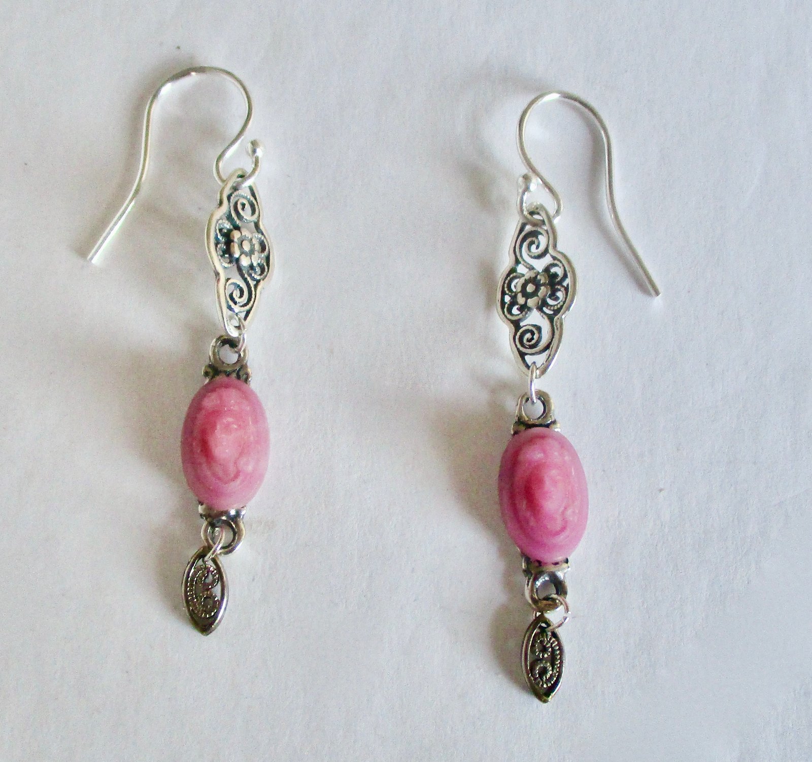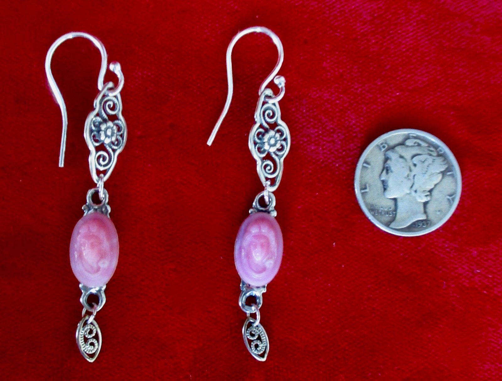 New-old stock. The earrings’ components are all from the early days of the 20th century but they only assembled in the 1980’s. The oval pink cameos are frosted glass from Czechoslovakia. The earring wires are marked “925” sterling. The other components test for silver