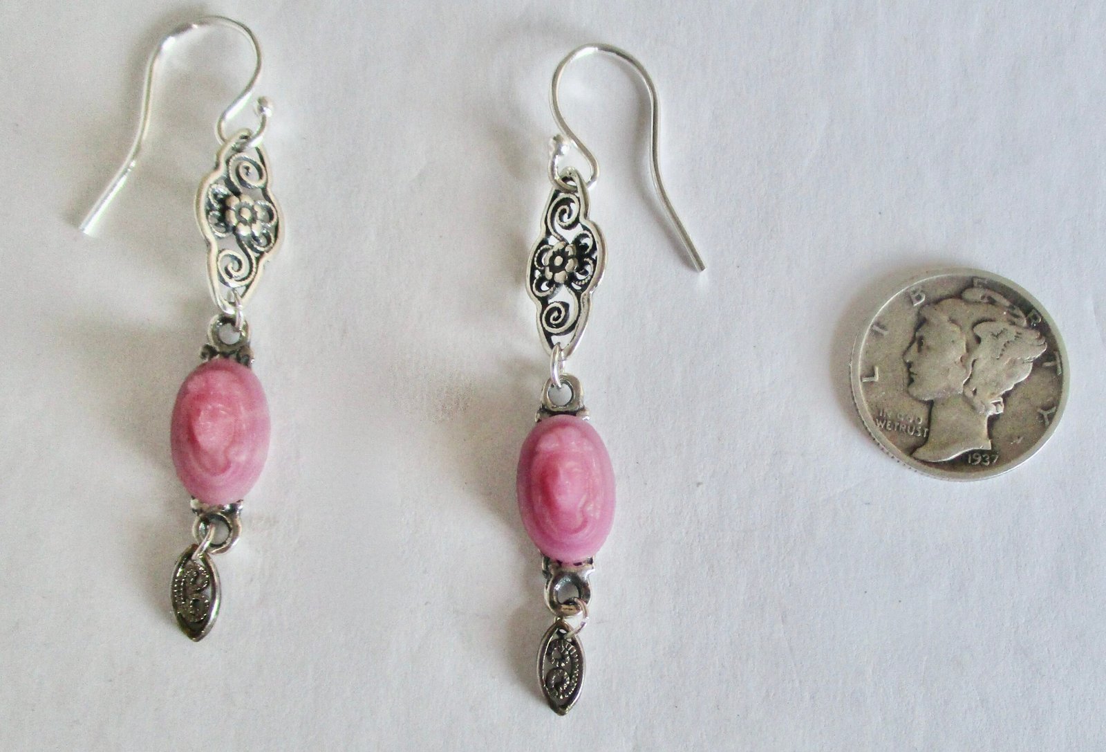 Pair of Antique Sterling Silver Earrings With Oval Pink Frosted Cameos. Circa. 1900. American