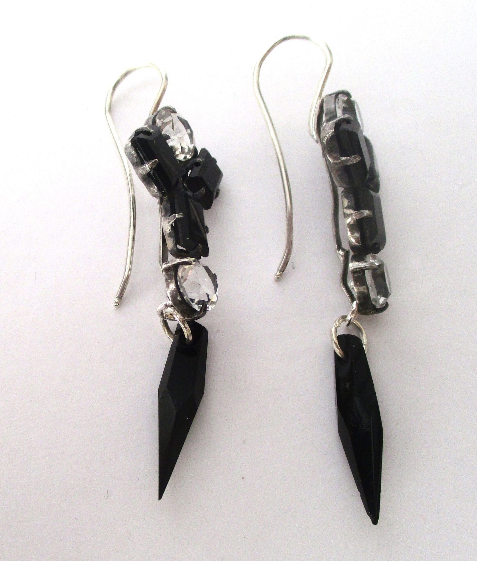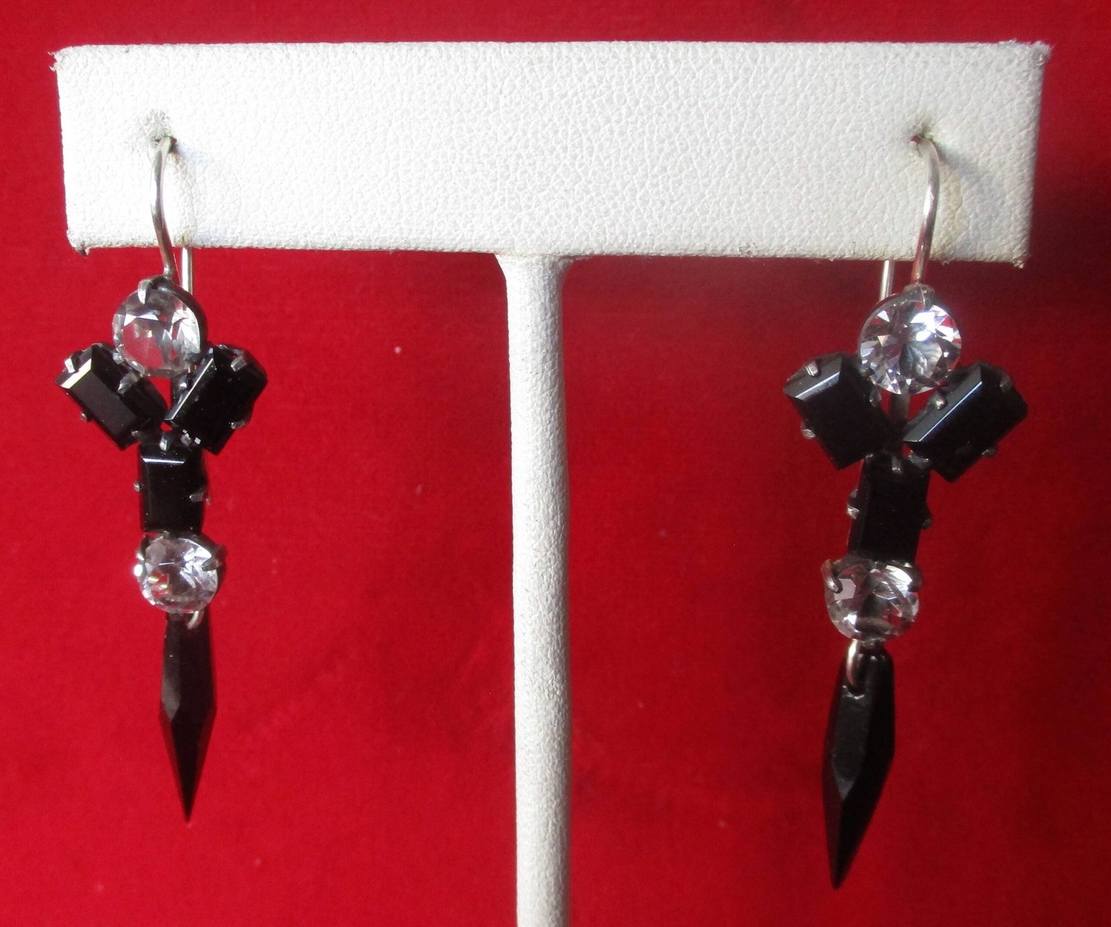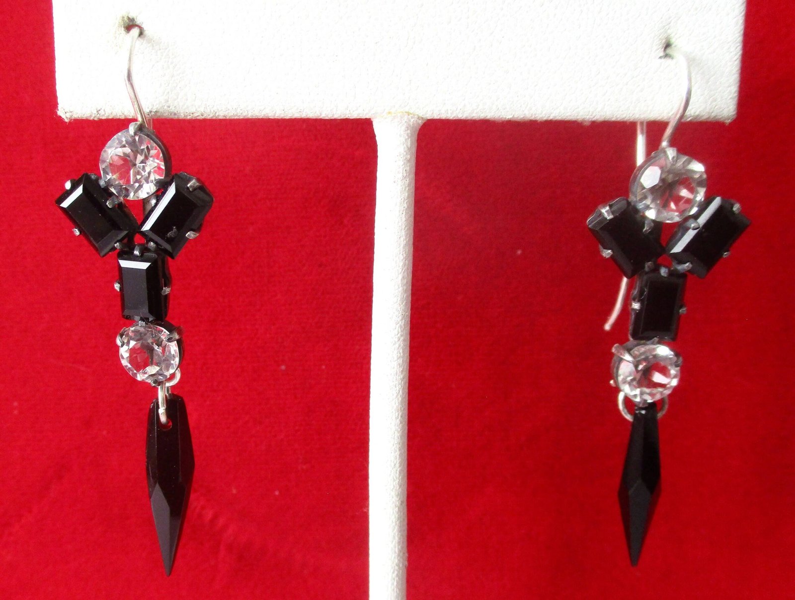 Pair of Antique Sterling Silver Earrings With French Jet & Clear Paste Stones Circa. 1900-1910 France