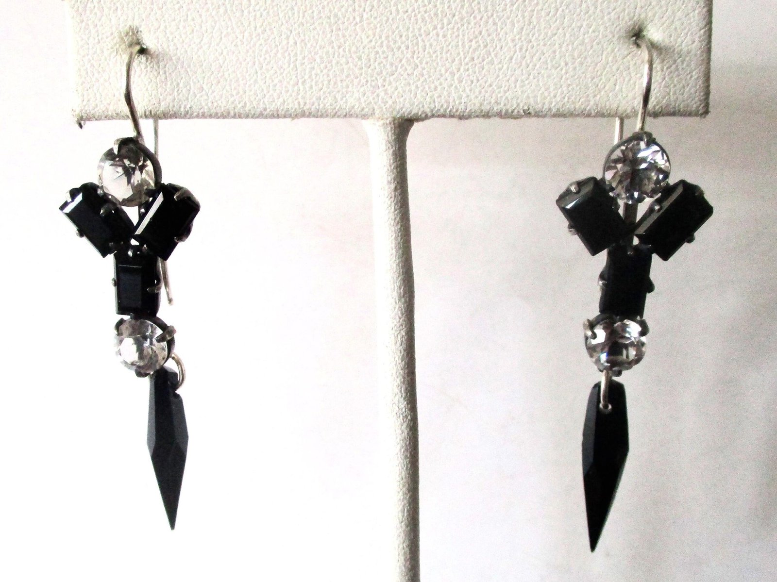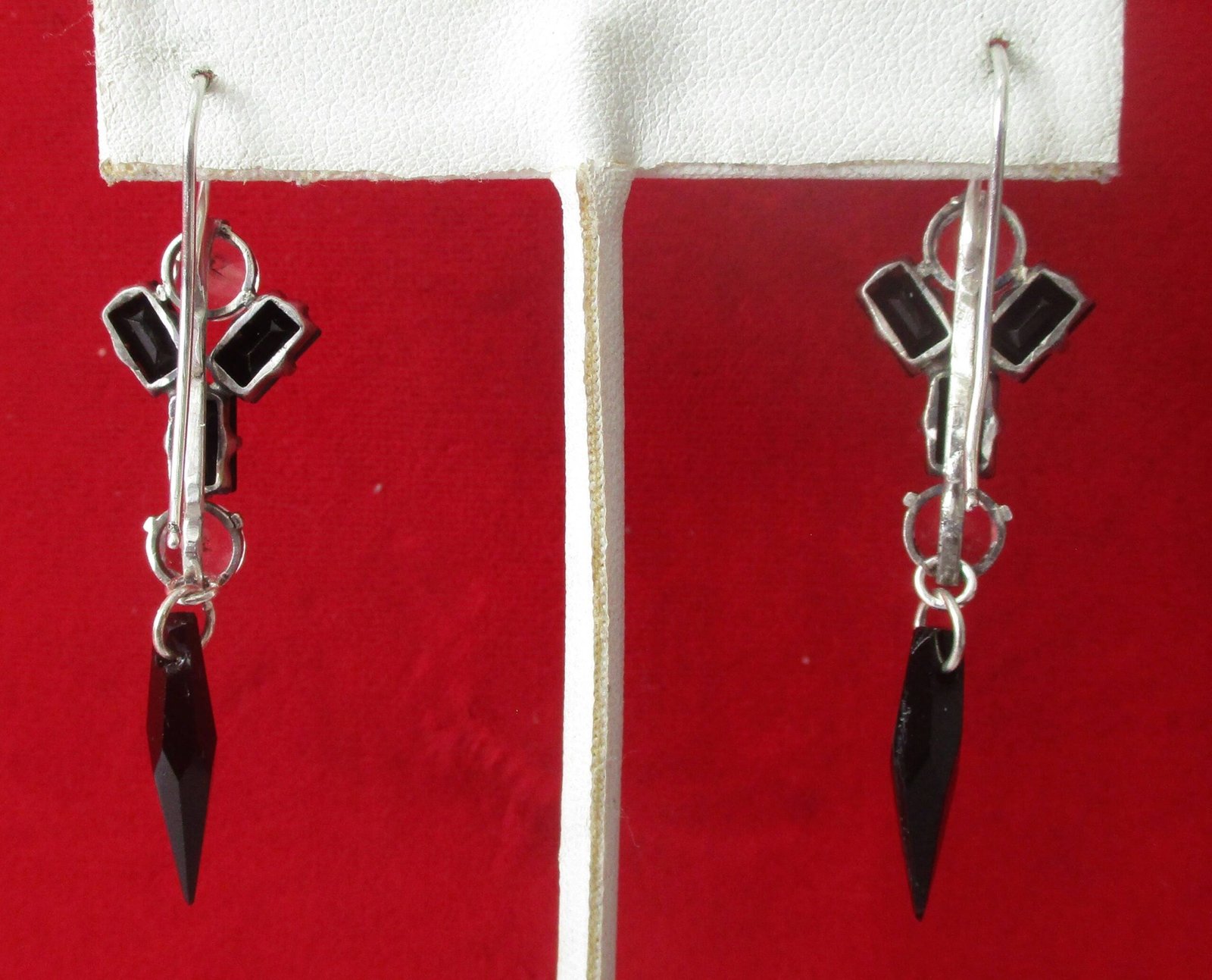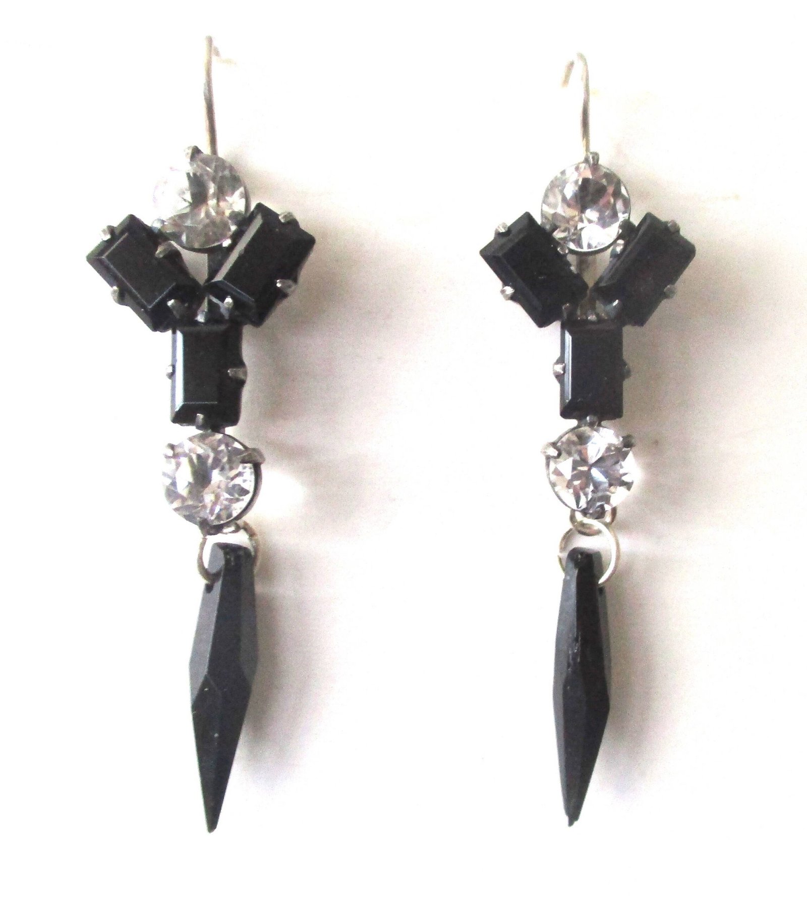 Pair of Antique Sterling Silver Earrings With French Jet & Clear Paste Stones Circa. 1900-1910 France