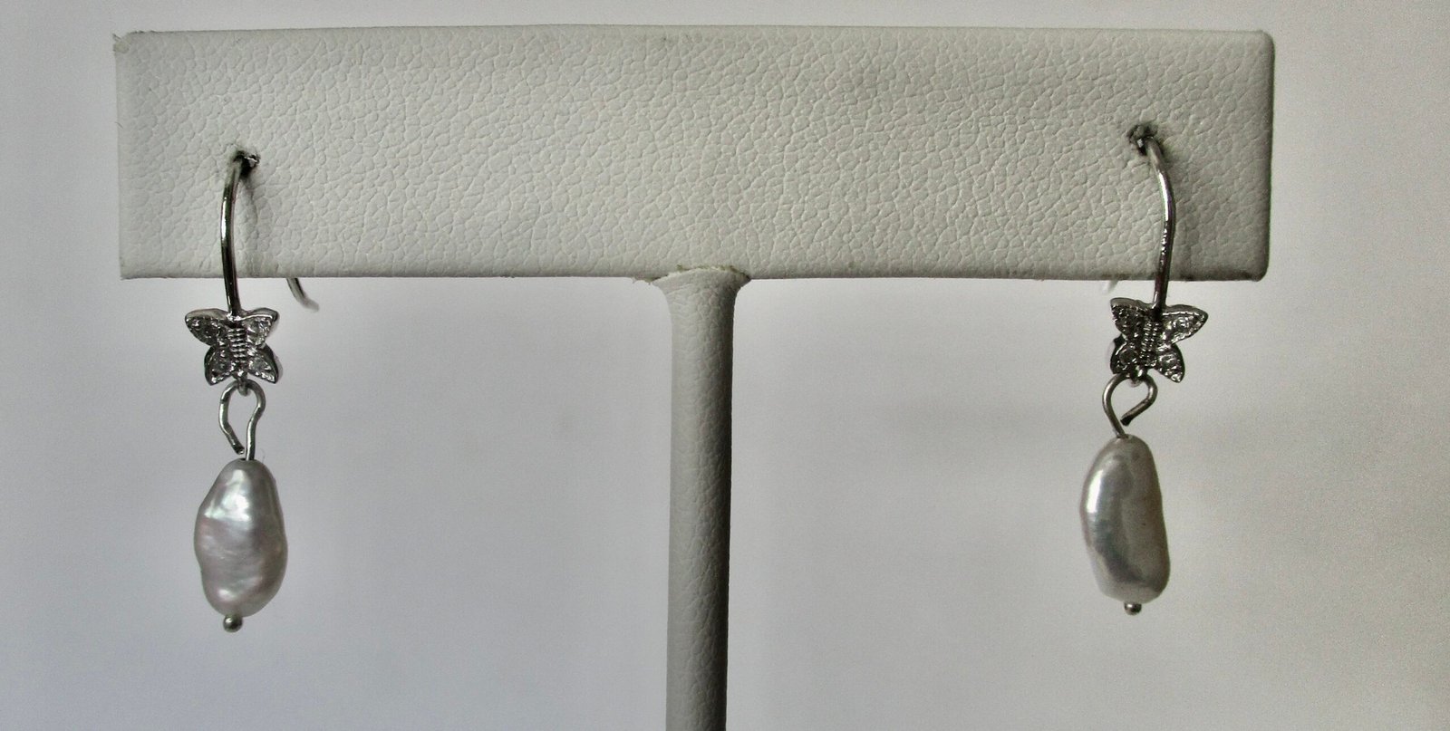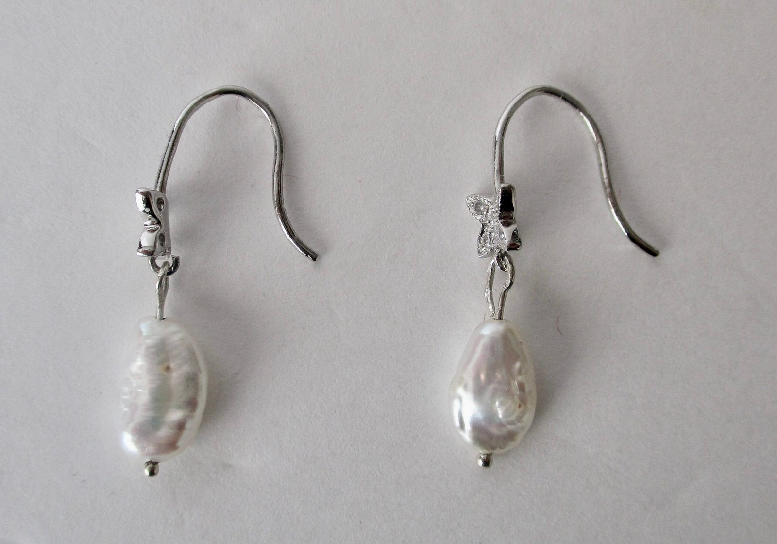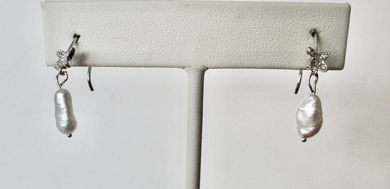 Lovely pair of butterfly earrings.     New-old stock.  Made with tiny clear rhinestones and sterling silver, these little gems were made in the 1990’s and never worn or sold.     Rice pearl is suspended from each earring at bottom.