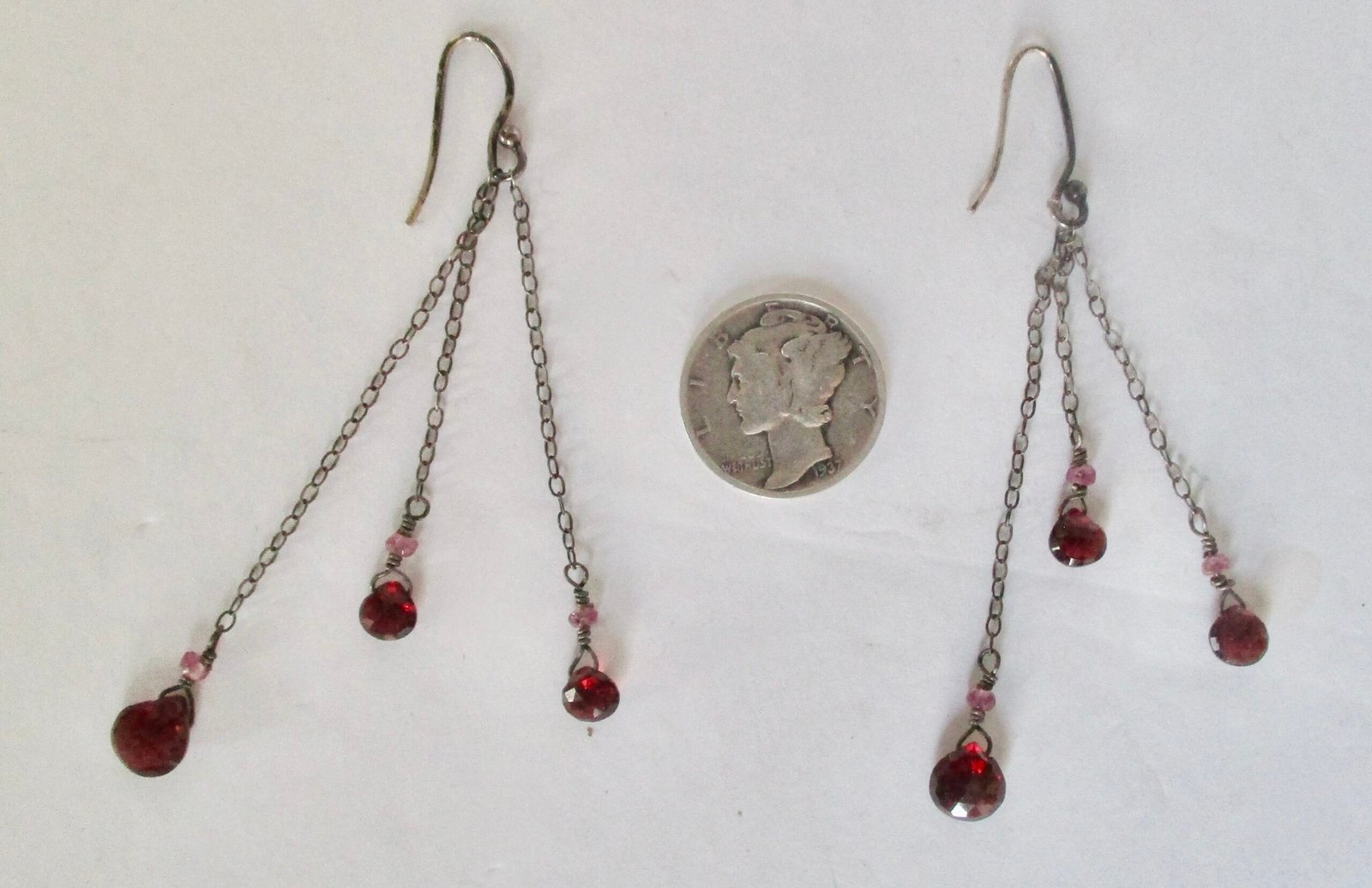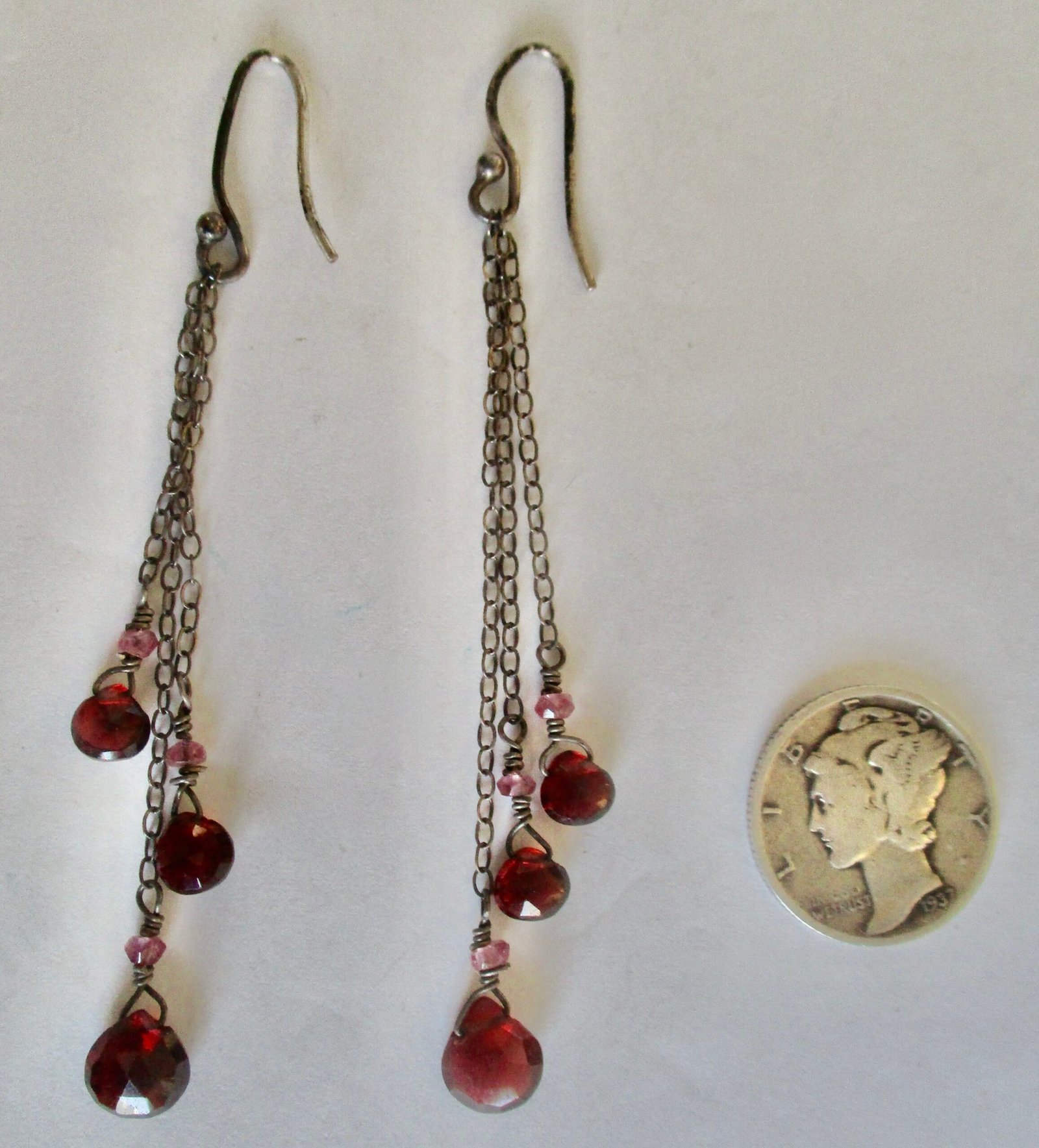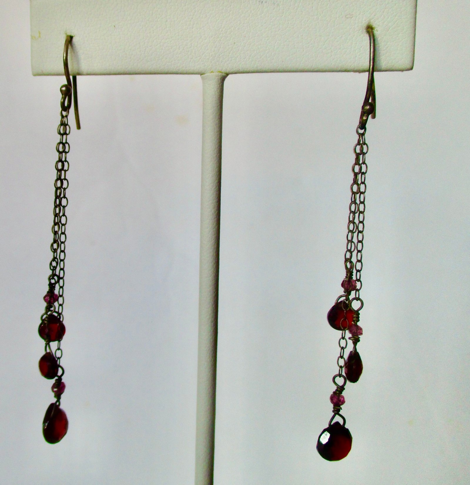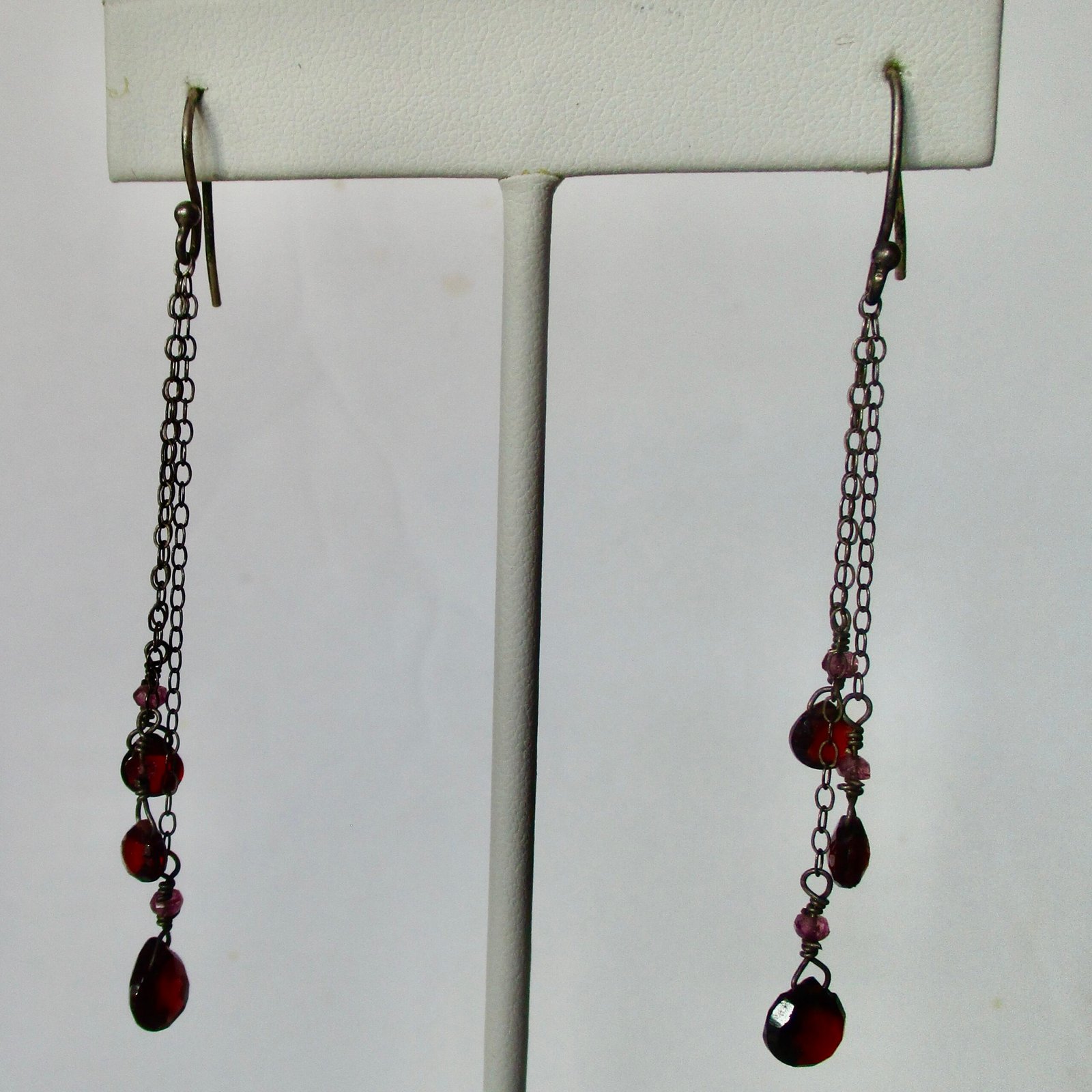 Sterling (unmarked but tested) chain with faceted garnets and the tiniest of amethysts. All tested. Each earring measures 2 3/4 inches long. The three chains sit together, so the width is only less than 1/4 inch…..the chains sway when you walk. Total weight for the pair is a comfortabe 2.2 g.