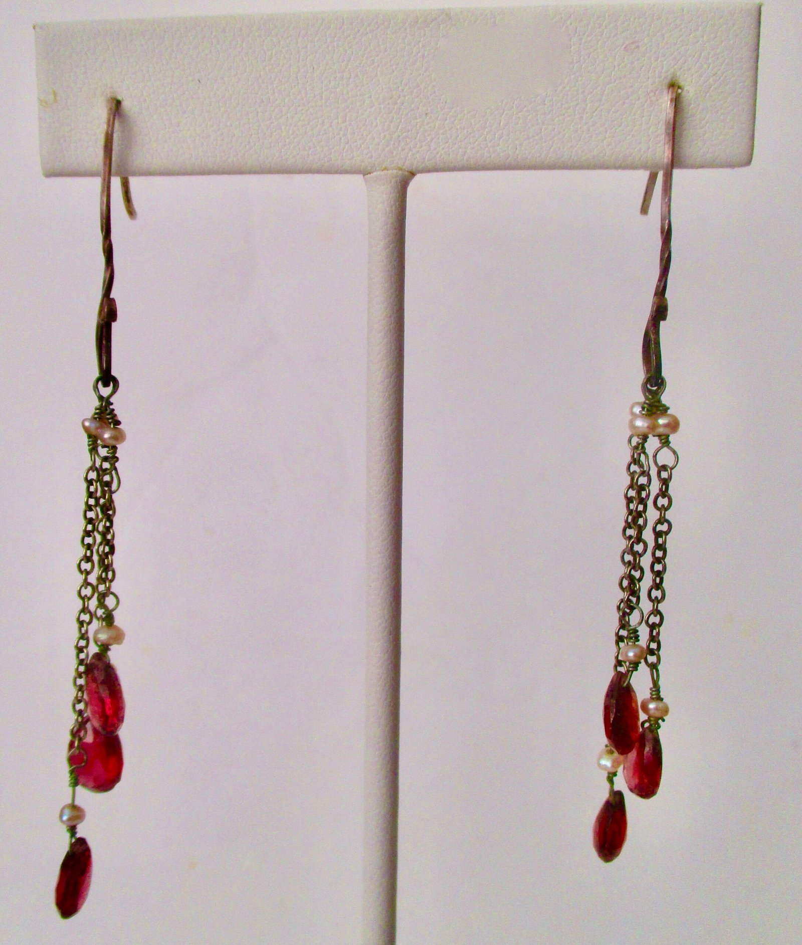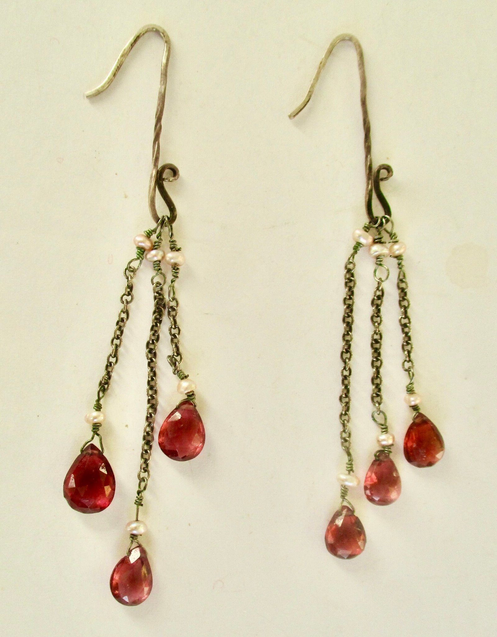 Lovely pair of sterling chain earrings, marked “925” on wire, with teardrop faceted garnets. Each earring is 3 inches long. Each earring has three chains and they hang together; sway when you walk