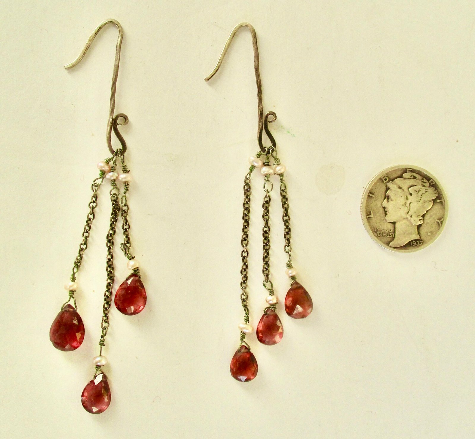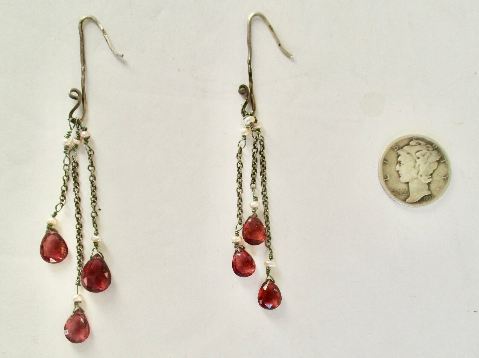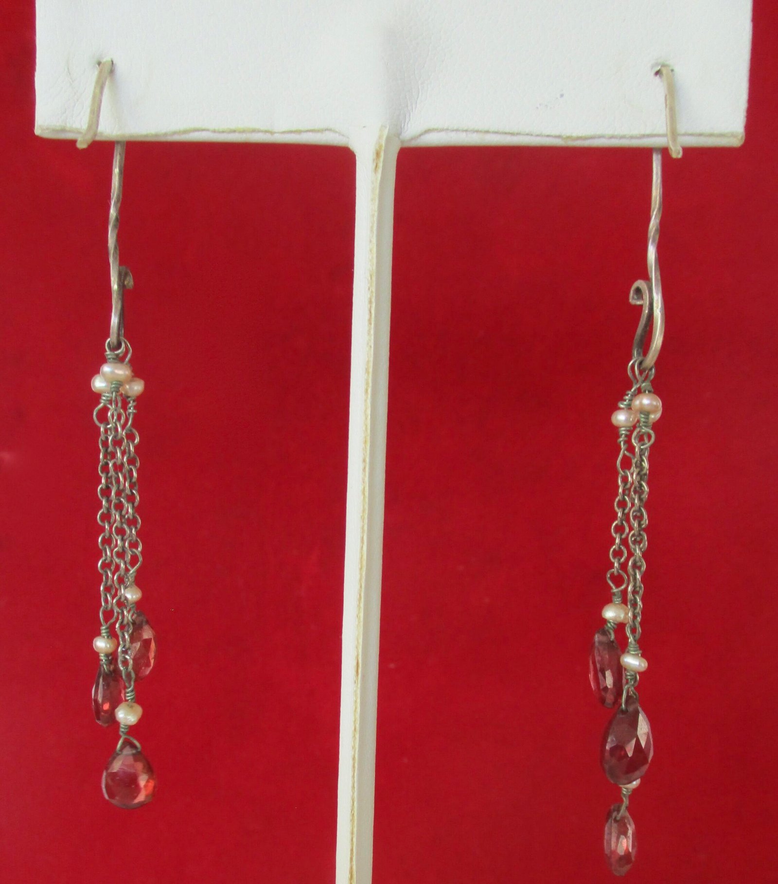 Pair of Vintage 3-Inch Sterling Silver Earrings With Teardrop Faceted Garnets and Tiny Seed Pearls circa. 1980 American
