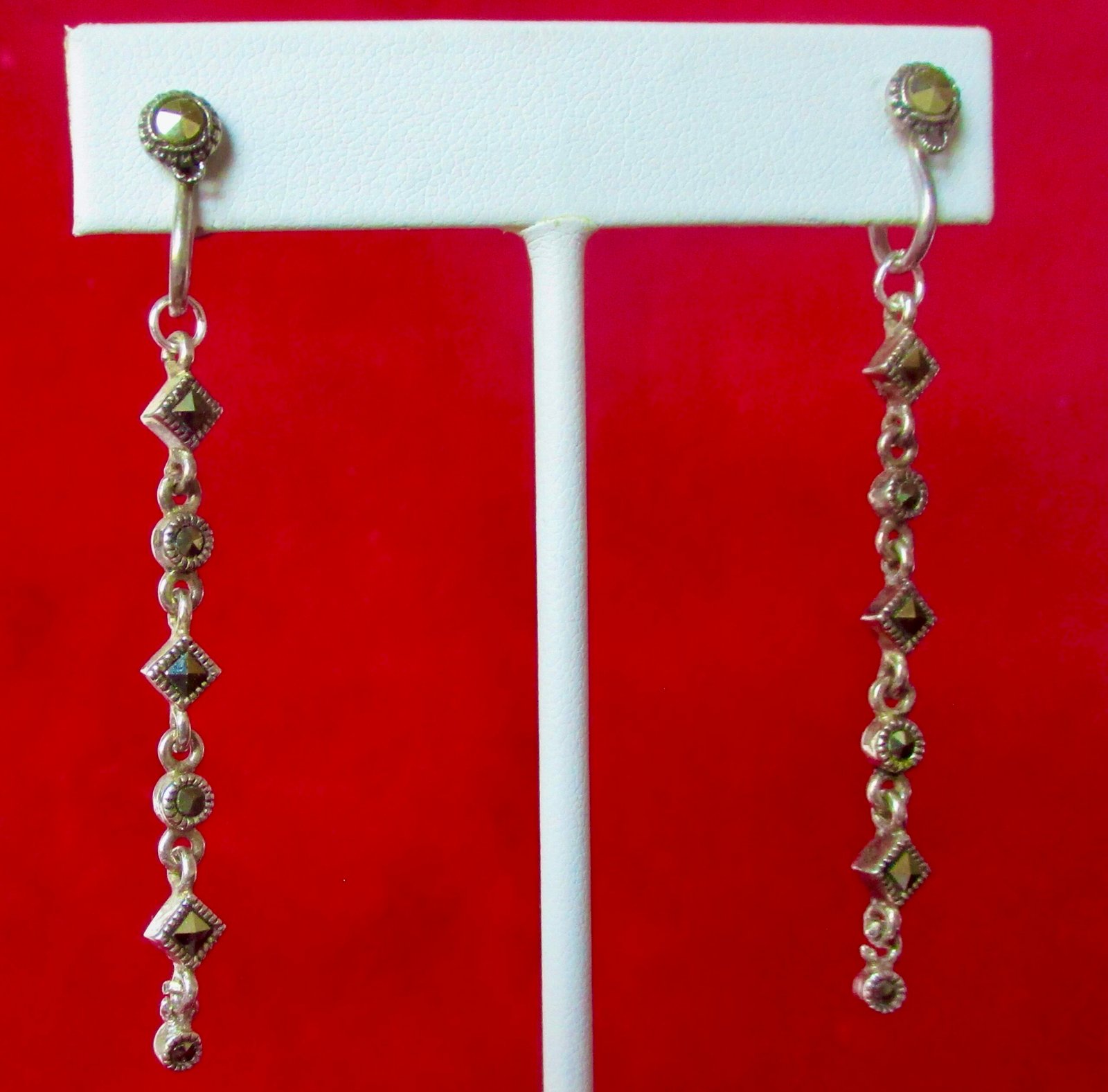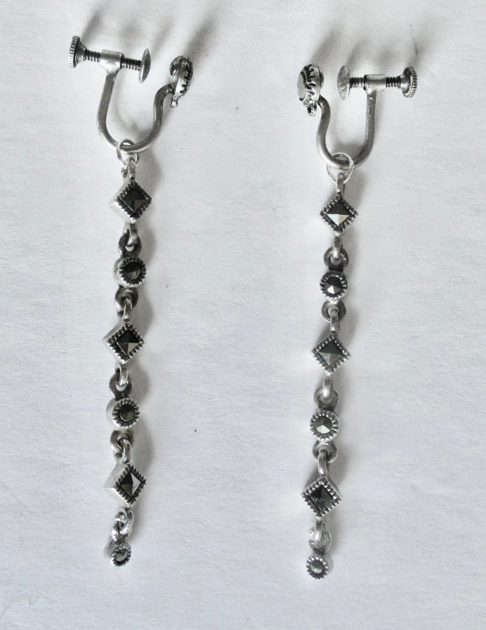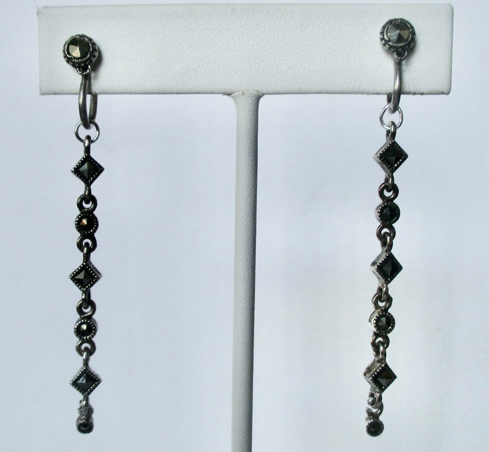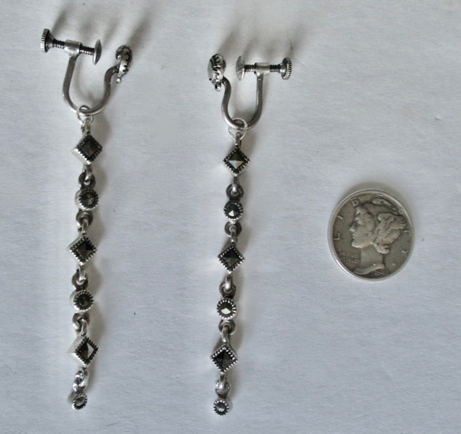 Sterling and marcasite screw back earrings. Marked “sterling”. Light, comfortable to wear. Will never go out of style. So slim and so chic!