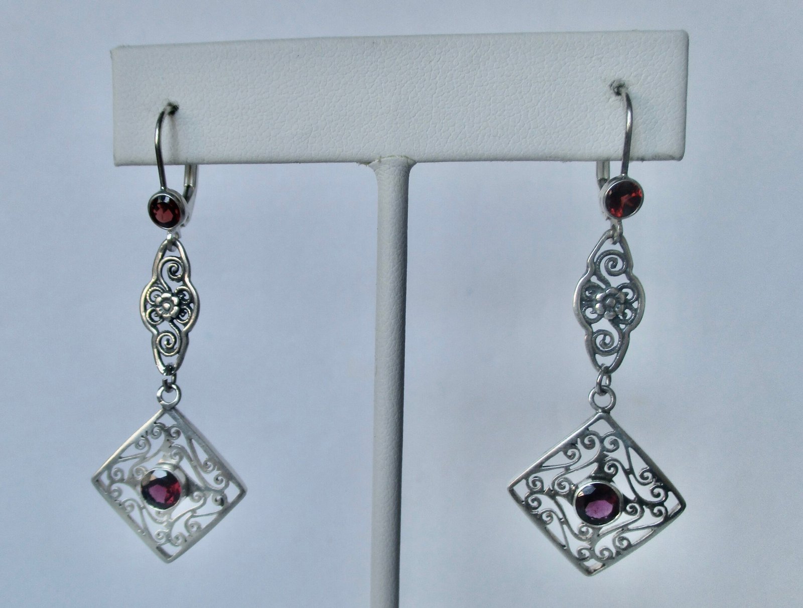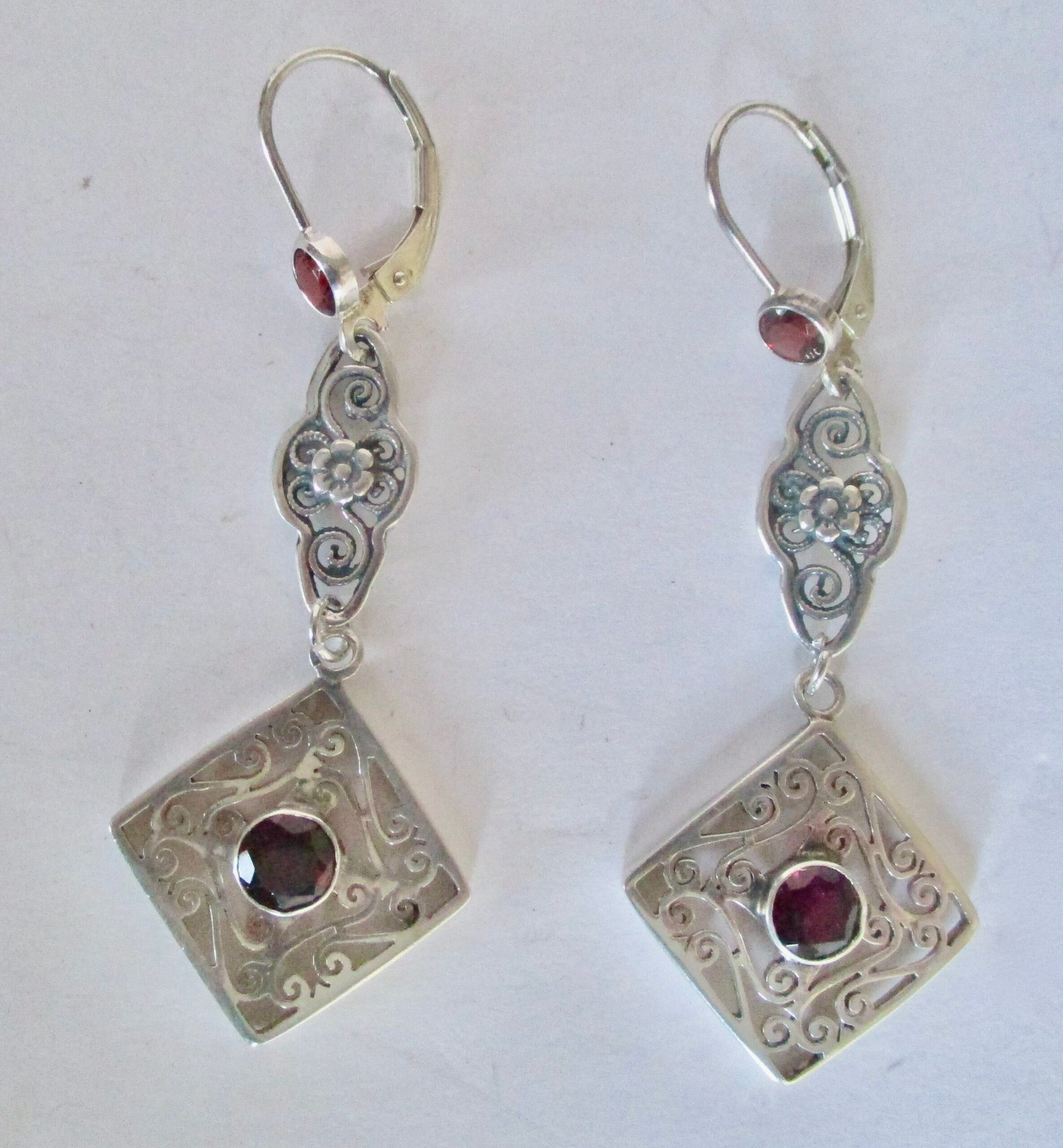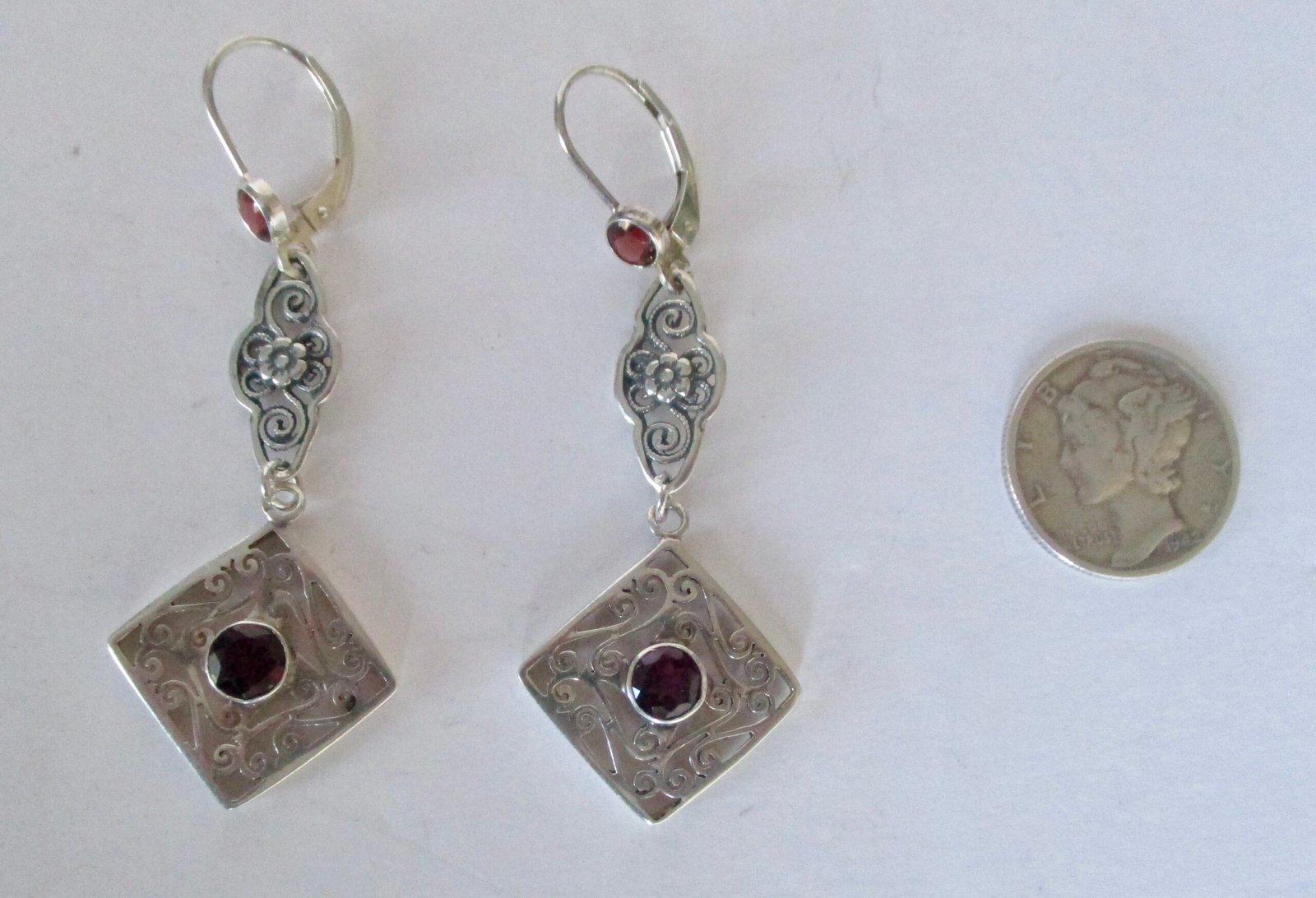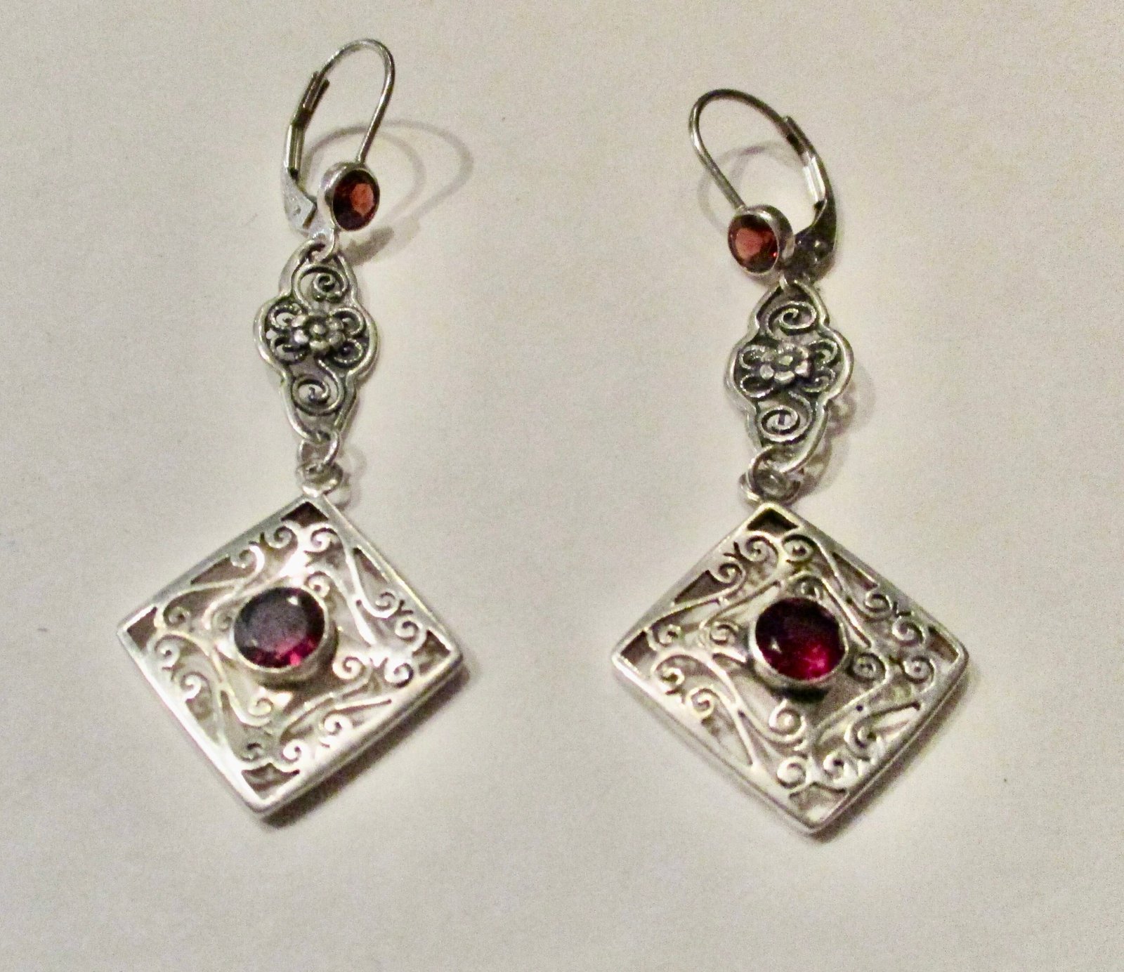 Natural red garnets in a bezel setting, two on each earring.    Marked “925” sterling.  Each earring measures 2 inches long with lever back ear wire.     3/4 inch wide, at its widest.   Total weight for the pair is a comfortable 4.5 g.    2.9 dwt