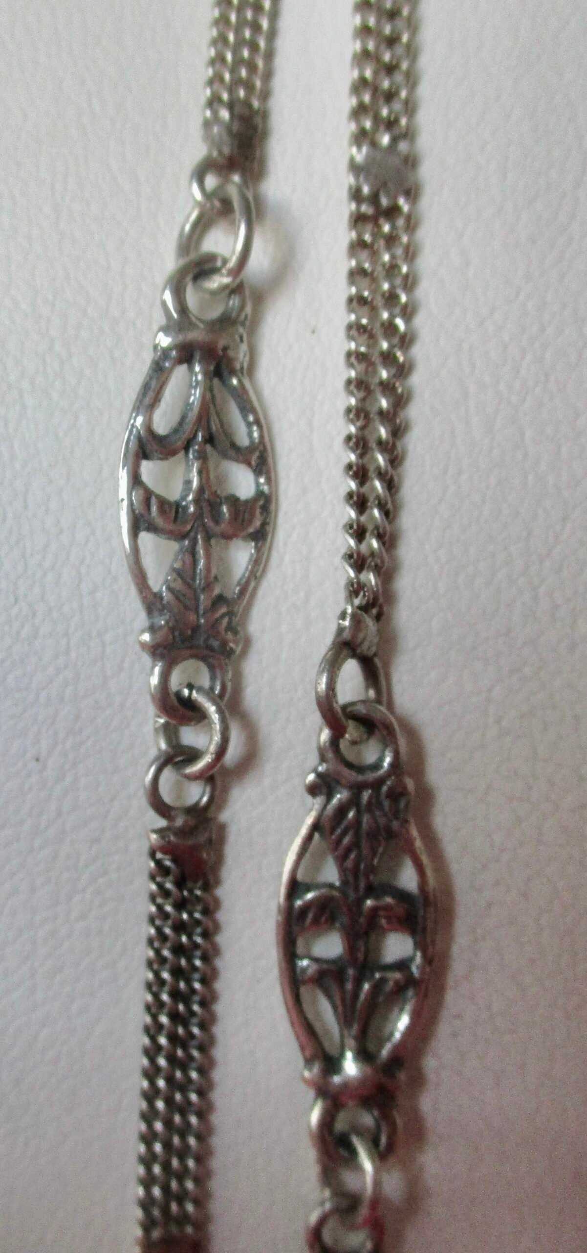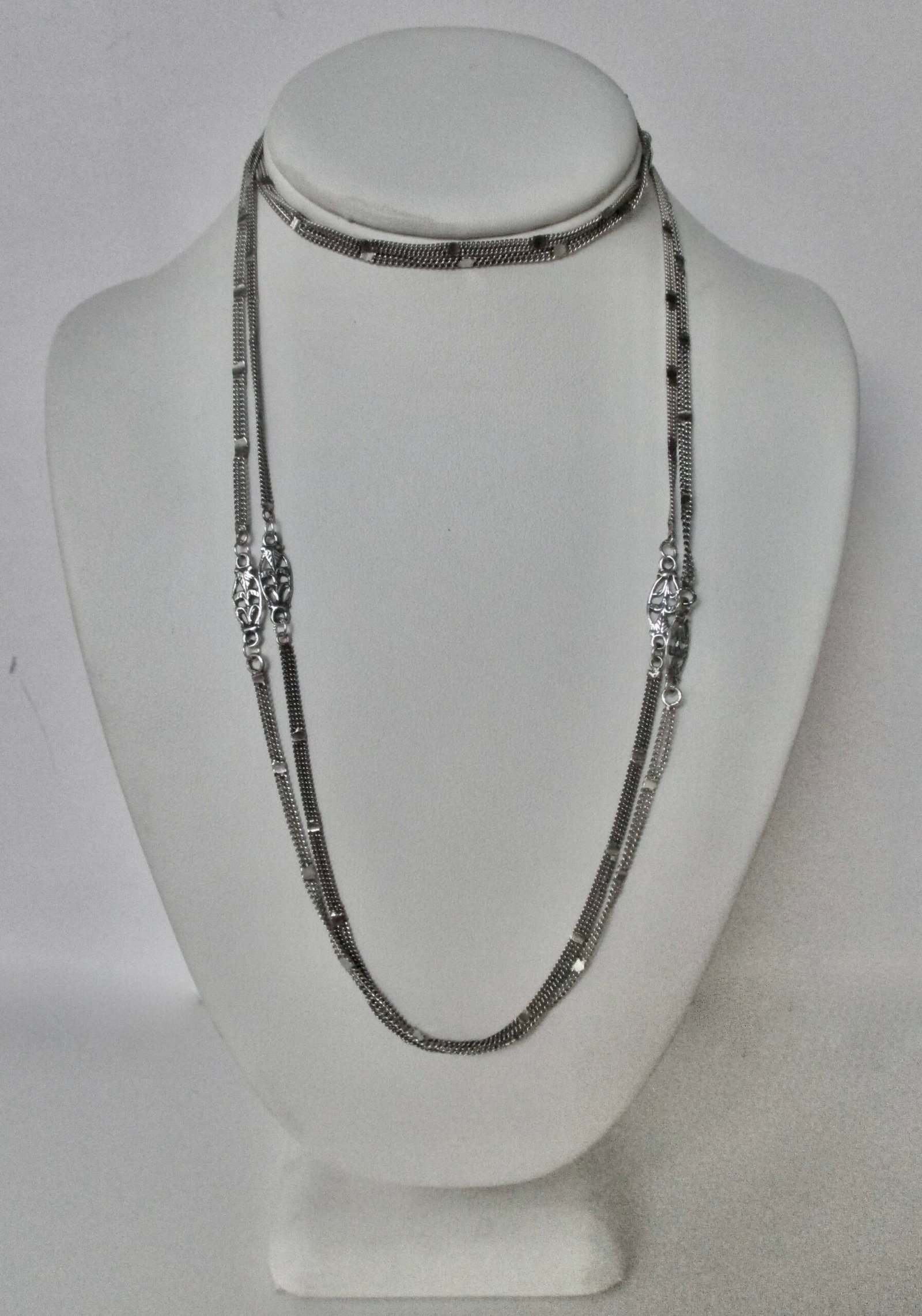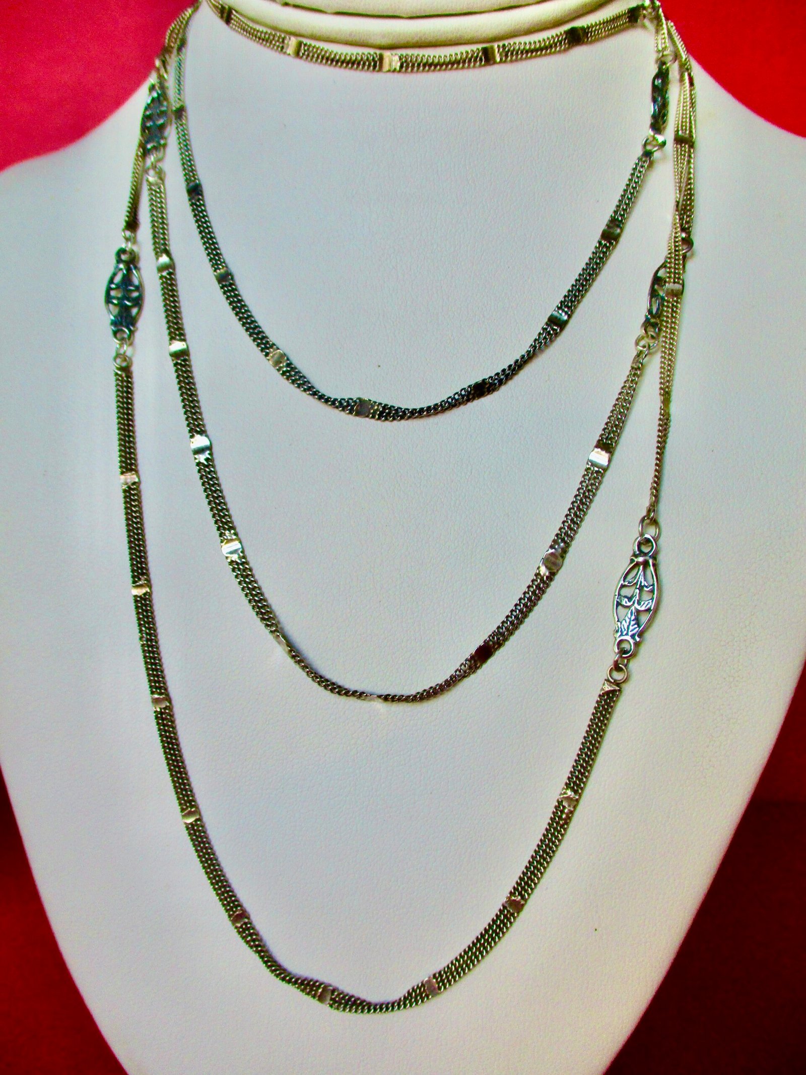 Really lovely hand made pair of 32-inch long sterling silver chain necklaces, each with 4 flat stations.   Wear them alone, or add others from your collection.    These are a fine classic example of American jewelry craftsmanship.    Small spring ring clasps work perfectly.  This pair will always be in style.  Unmarked but tests for sterling