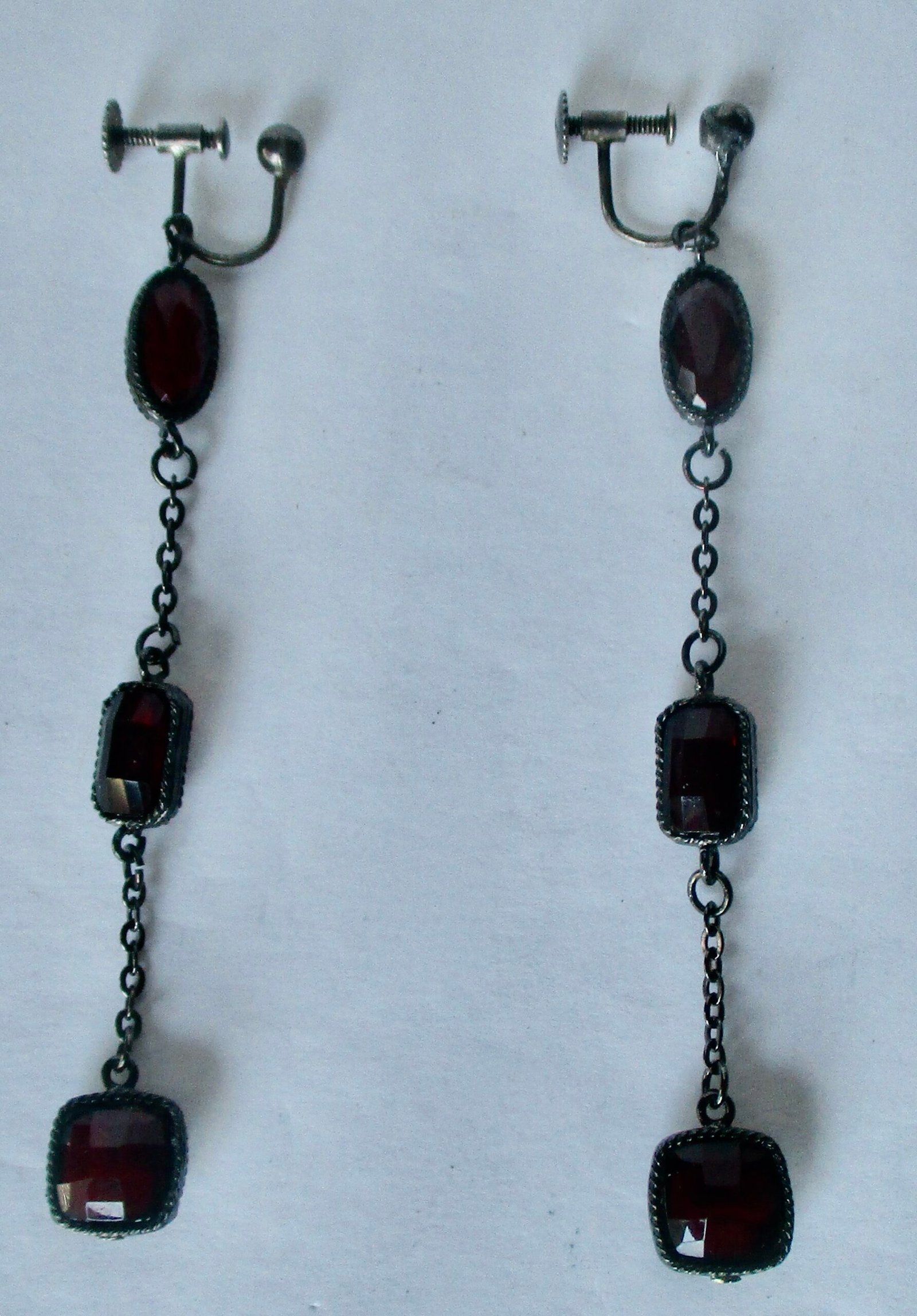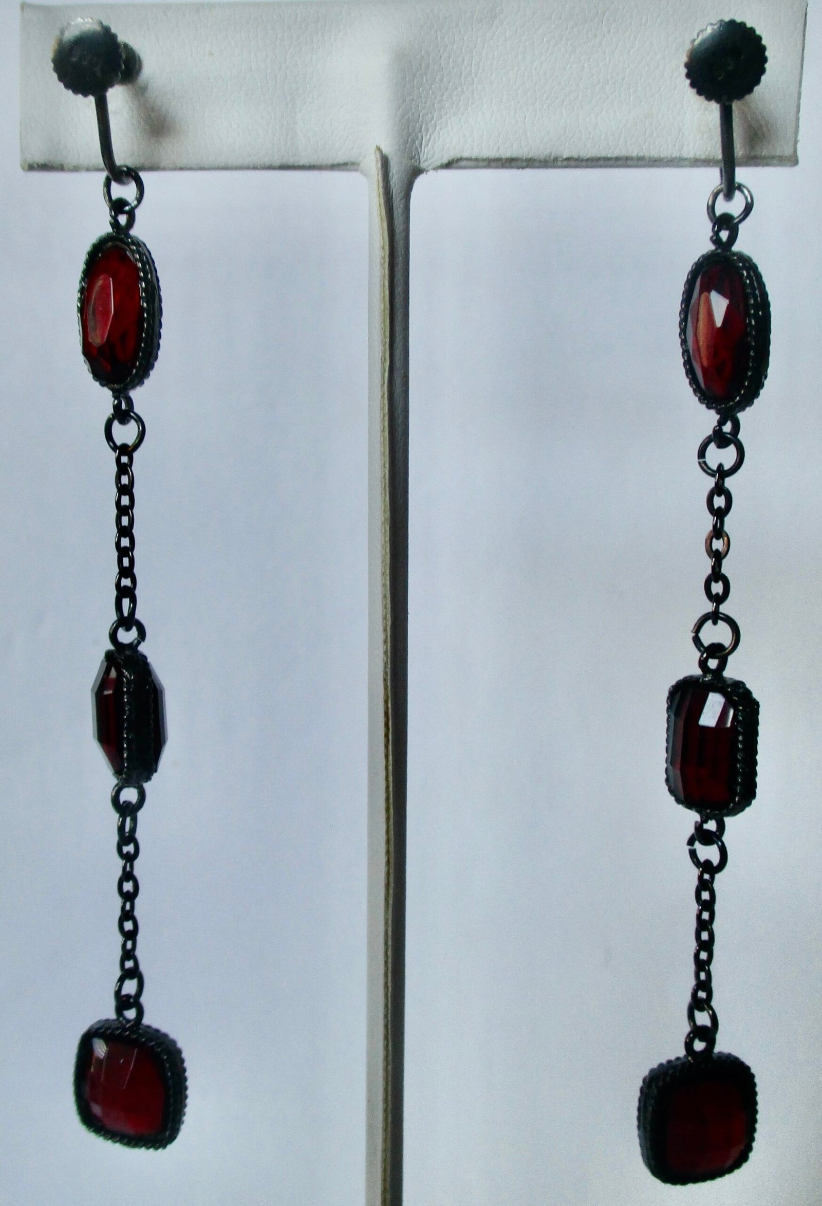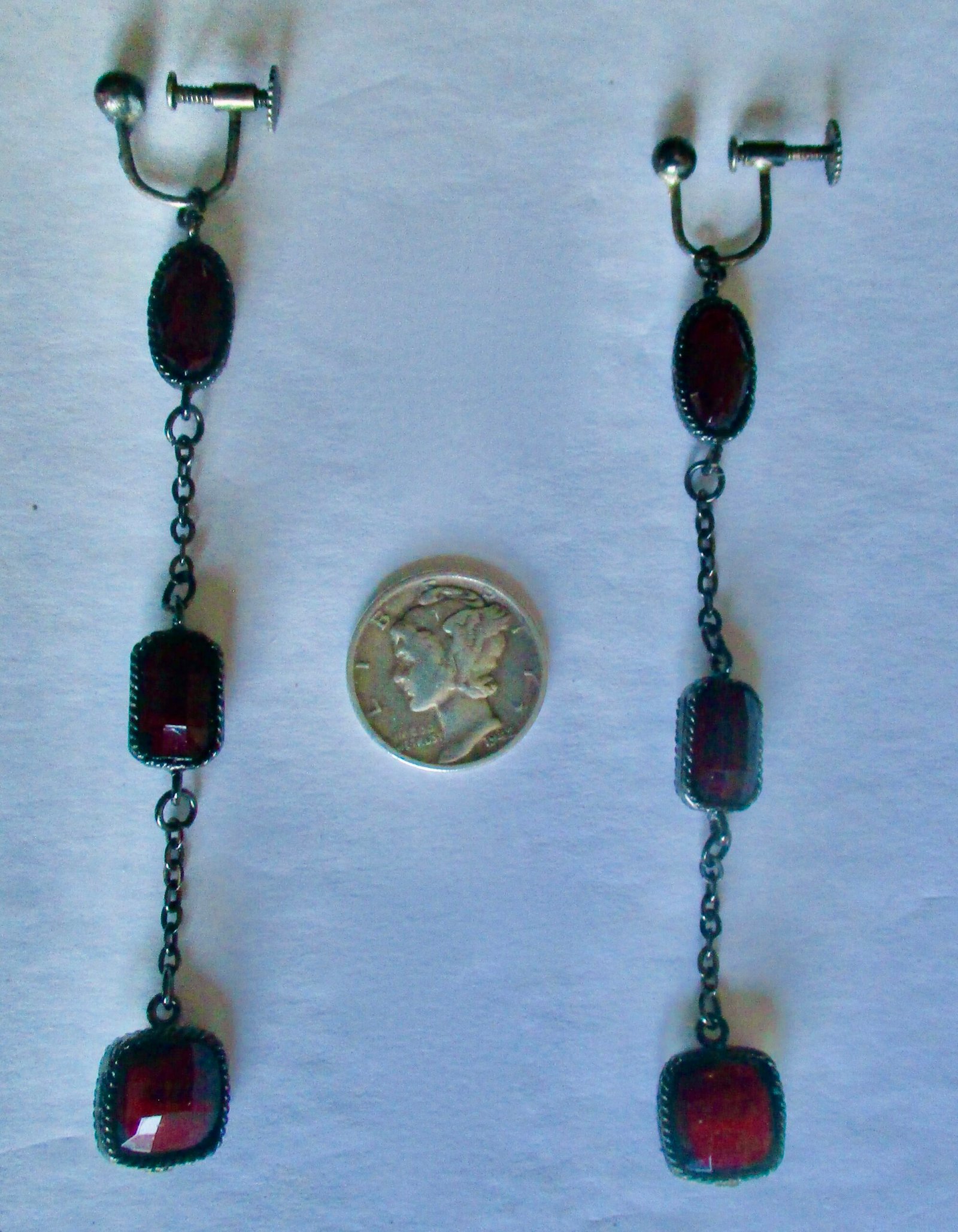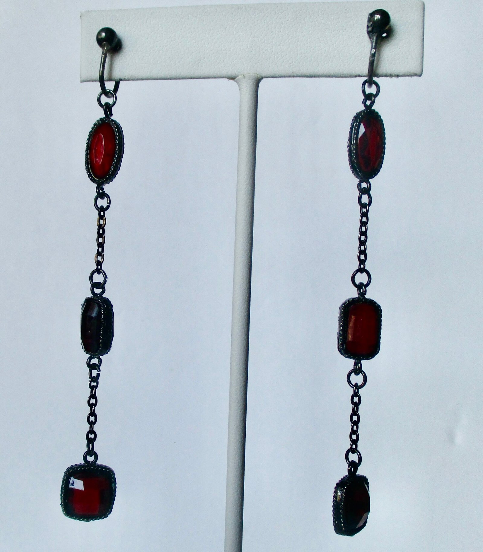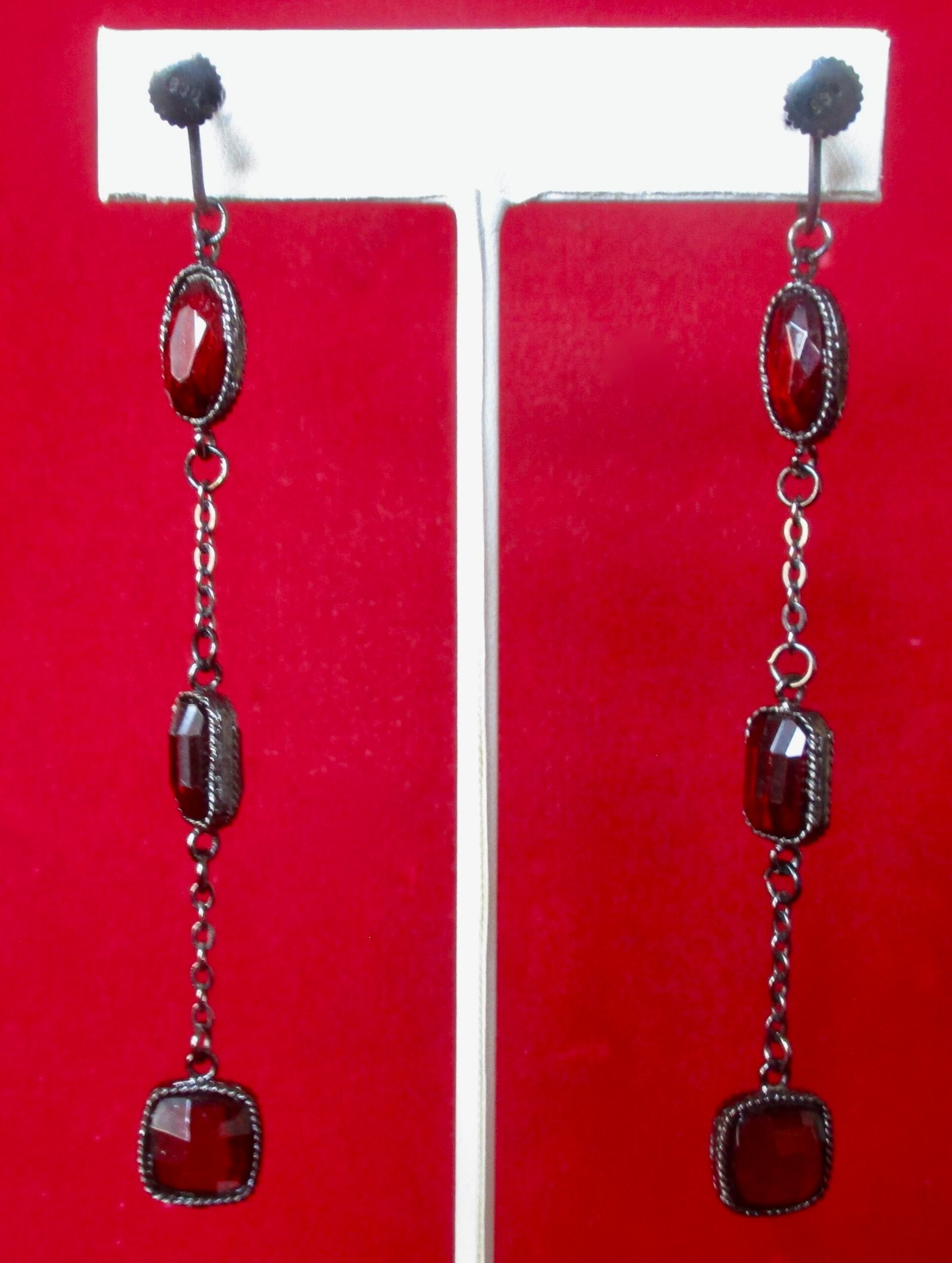Lovely pair of gunmetal color 3 3/4 inch earrings with deep red crystal drops. These faceted red crystal screw back earrings really sparkle! Each earring measures 3 3/4 inches long and 1/2 inch wide, at its widest. total weight for the pair is a comfortable 7.5 g. 4.8 dwt