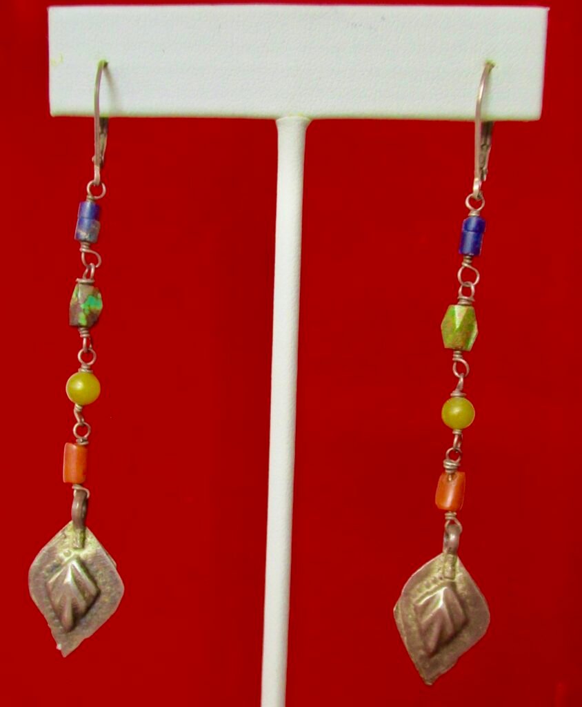 Pair of Antique Chinese 3-Inch Sterling Silver Earrings With Natural Stones